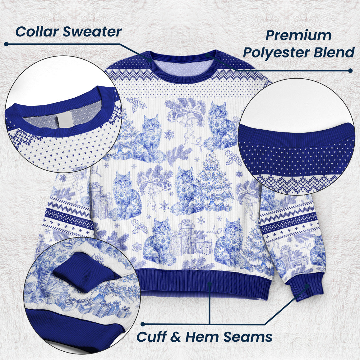 Beyond its distinct pattern, this Ugly Sweater tells its own tale of bonding and resemblance. Wearing it becomes a charming statement of your beloved pet, keeping them close even in the heart of winter. Make your holiday selfies and family portraits pop with its whimsical cat-themed design in a classic Toile De Jouy style. Give it as a gift to the cat lover in your life or get one for yourself, either way, it’s bound to bring smiles all around. Capture the essence of winter fun and pet love in one go with this sweater. Order it now and add a dose of feline festivity to your holiday wardrobe!