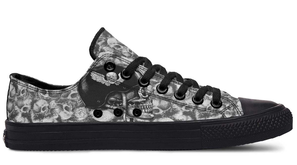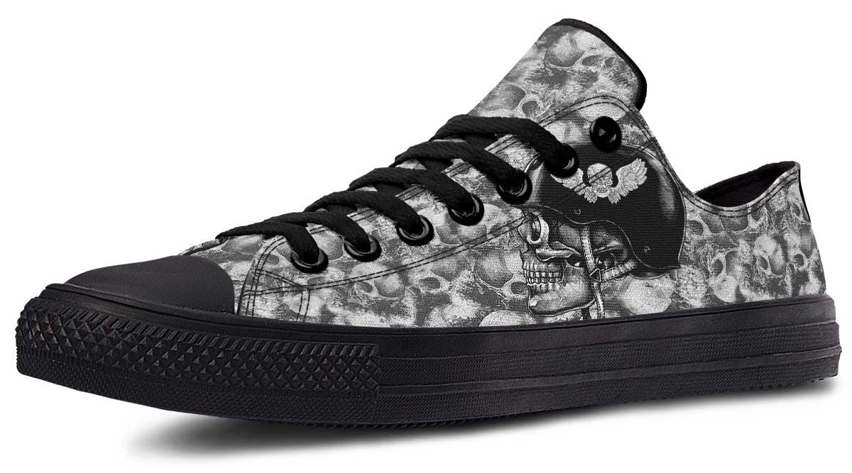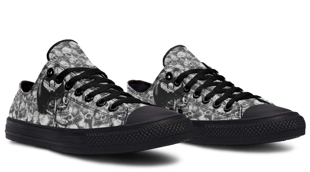 Add an edge to your look with Skull Rider Pattern Black Lowtop Sneakers. Featuring a bold skull design and cushioned insoles for all-day comfort and style.